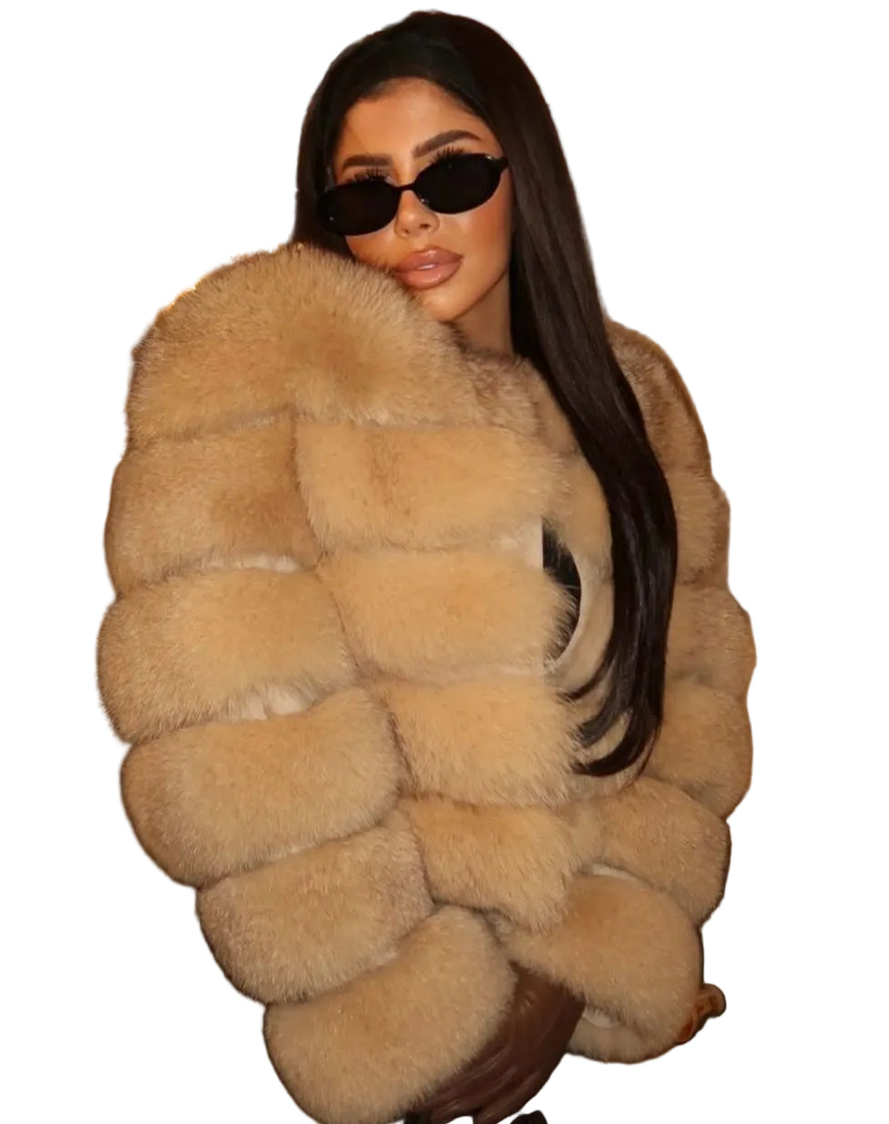 A soft champagne-toned fur jacket with a bold, voluminous silhouette. Exceptionally plush, warm, and effortlessly elegant — the ultimate statement piece for refined day-to-night styling.