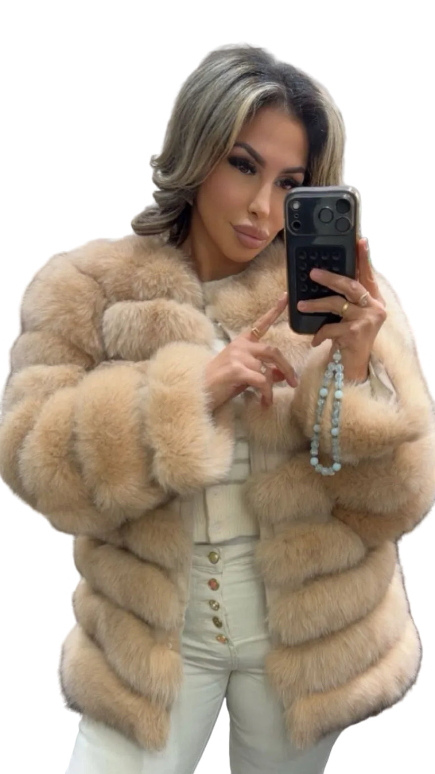 A warm golden-sand toned fur jacket designed with a bold, layered silhouette and a plush, voluminous finish. Soft, elegant, and effortlessly glamorous — the perfect statement piece to elevate any look from day to night.